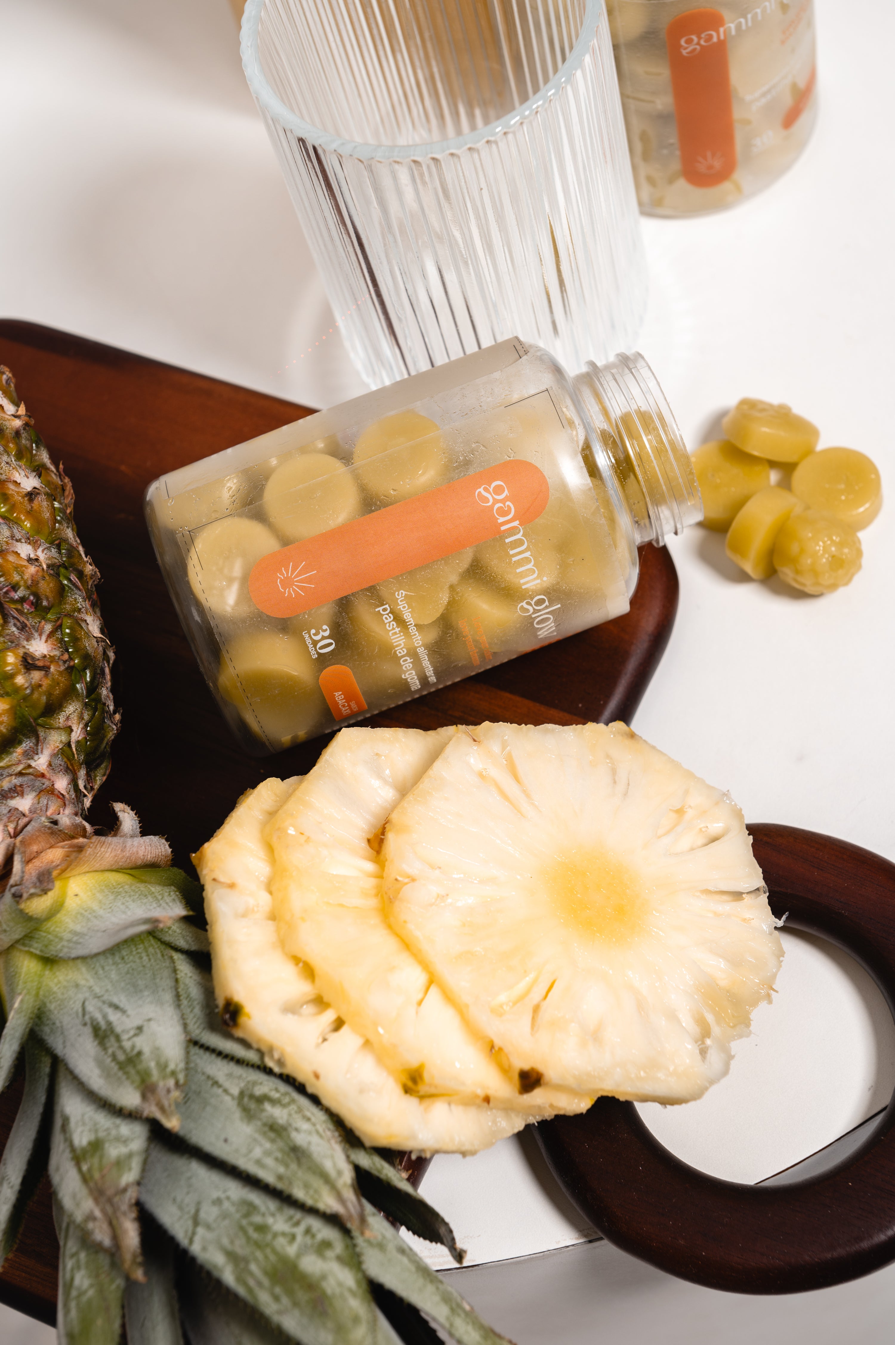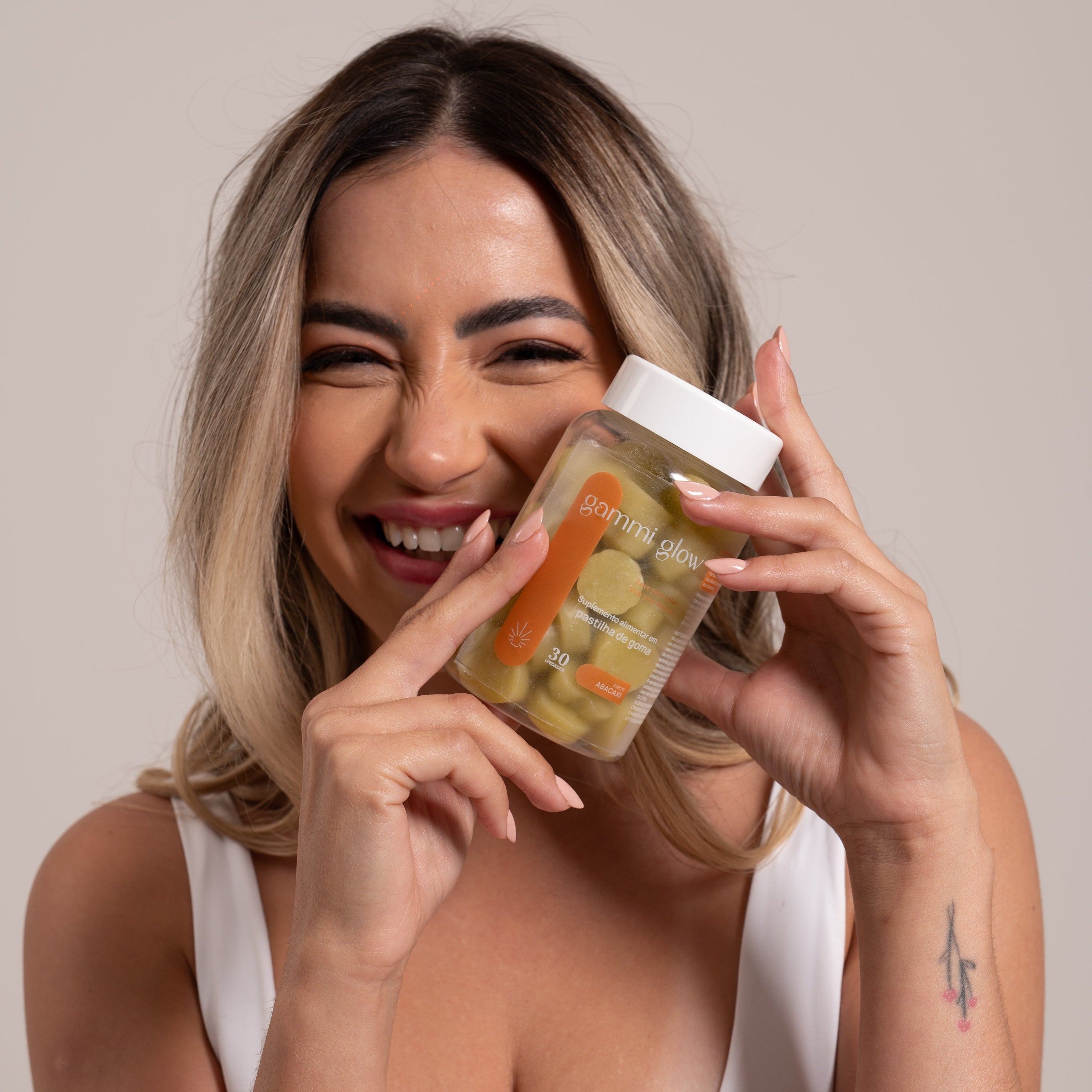 Você quer o bronzeado perfeito e de forma saudável? Com a Gammi Glow, você pode! Desenvolvemos uma fórmula exclusiva com L-Tirosina, Vitaminas A e E, e Cobre, ingredientes que não apenas aceleram o processo de bronzeamento, mas também cuidam da saúde da sua pele, garantindo um brilho natural e duradouro. Com o delicioso sabor tangerina das nossas gummies, agora você pode conquistar o tom dourado dos seus sonhos sem abrir mão da praticidade e do sabor.